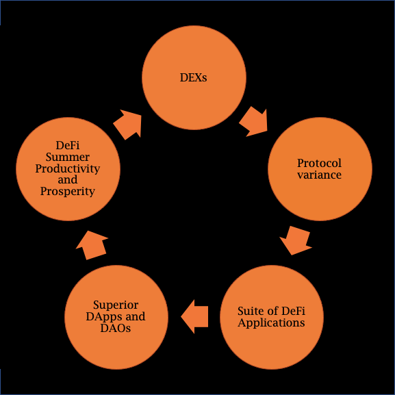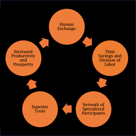 The starting point of any successful human network is peer-to-peer exchange. Bitcoin introduced peer-to-peer exchange natively to the internet and Ethereum expanded it with decentralized exchanges (DEX). Human exchange saves time, resulting in the division of labor as participants focus on their relative advantages. On Ethereum, different developers focused on lending and borrowing with Aave, stablecoin creation with MakerDAO, liquid exchanges with Uniswap, or other innovative crafts. The division of labor develops into a network of specialized participants. On Ethereum, the division of labor led to the development of a suite of specialized, interoperable, and decentralized financial applications. Specialized labor then creates more efficient tools. Better smart contracts enabled a resurgence in DAOs and superior dapps. Ultimately, better tools increase productivity and lead to prosperous golden ages like DeFi Summer. Then, the cycle repeats. Economic developments like trustless derivatives and cultural developments like NFTs are born, shocking both the physical and digital worlds.