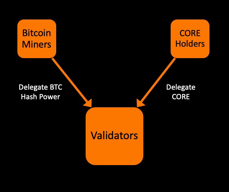 Individually, PoW and DPoS are powerful consensus mechanisms, but what makes Satoshi Plus special is the combination of the two. In order to combine the decentralized security of BTC-powered PoW and the scalability of DPoS, Satoshi Plus’ Validator Election Mechanism selects Validators with the optimal blend of BTC hash power and staked CORE to comprise the Validator Set and produce blocks both securely and efficiently. With a lean Validator Set securely elected by a decentralized delegating/voting base, Satoshi Plus offers a high transaction rate and increased scalability without compromising security and decentralization.