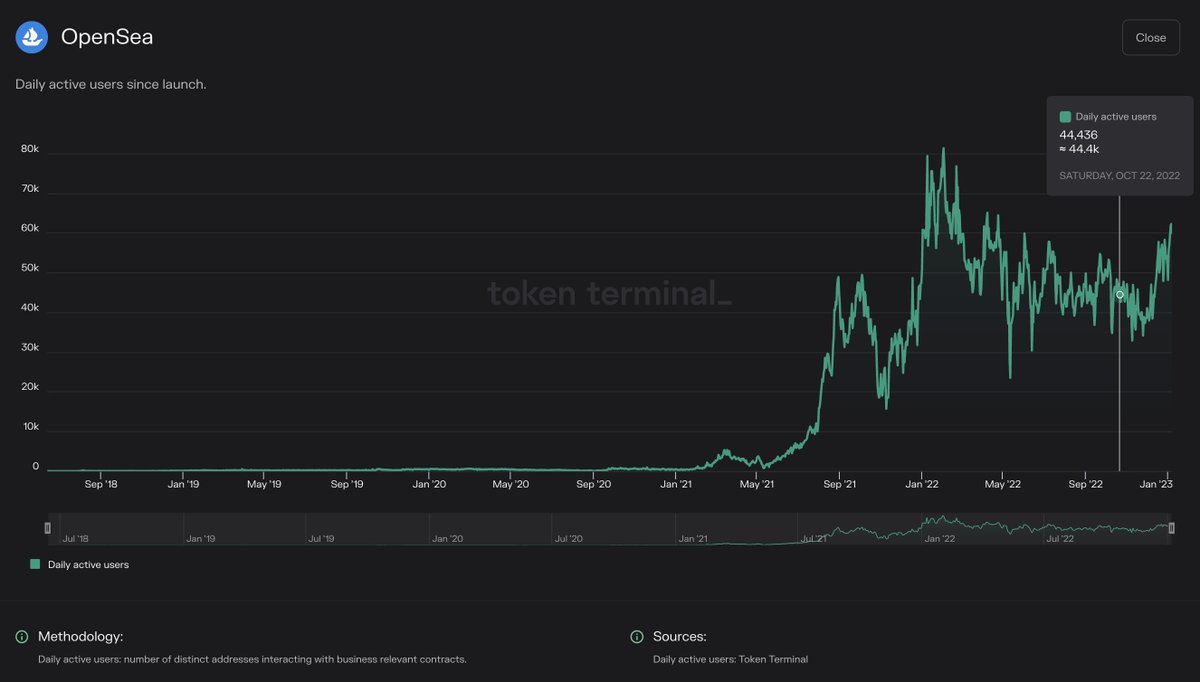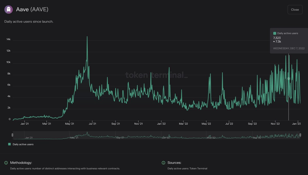 Daily active users: This metric tells us how many unique addresses call a protocol’s revenue-generating smart contract functions. DAUs should be viewed together w/ the fees metric to understand how much each DAU is paying (easier to have more users if the service is cheap).