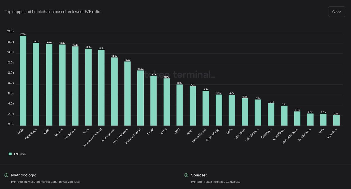 Snapshot of the latest P/F ratios: Currently, there are 15 protocols with a P/F ratio below 10.00x.
