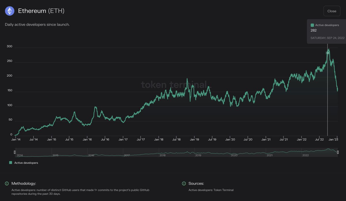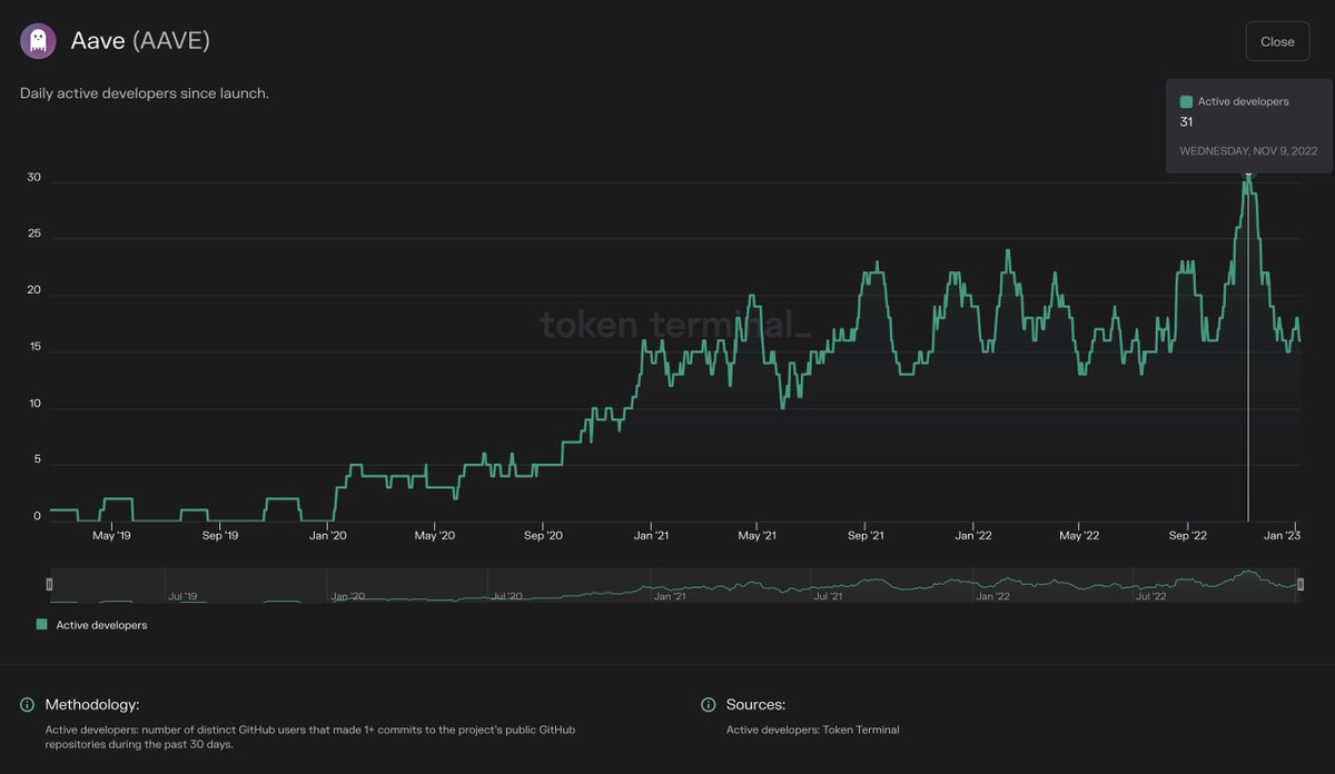 Active developers: This metric tells us how many developers are working on building the core protocol. It’s a good proxy for “developer leverage” when viewed alongside other fundamentals. E.g. fees, revenue, or earnings per developer.