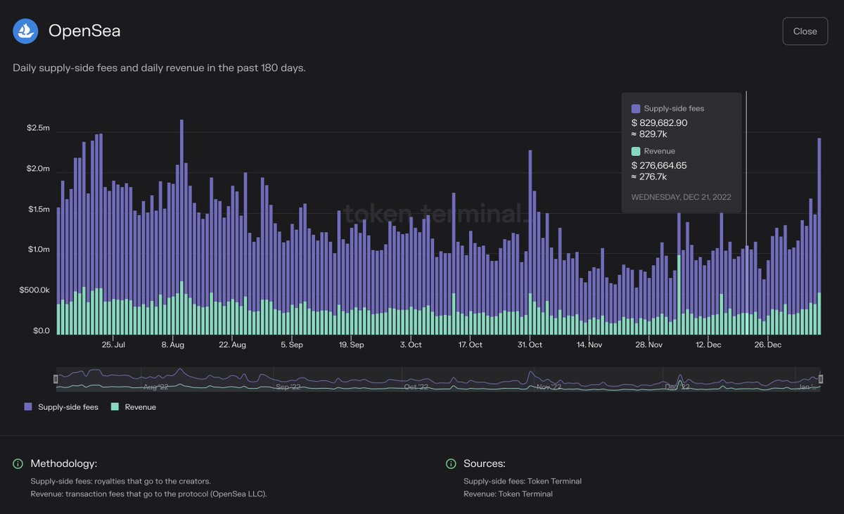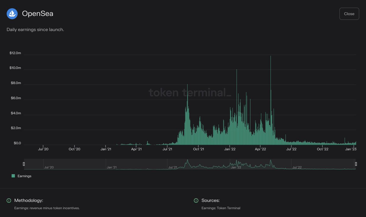 Fees: This metric tells us how much end users are willing to pay for the service that a protocol provides. Examples: – Blockchains = transaction fees – DEXs = trading fees – Lending protocols = interest – NFT marketplaces = royalties and marketplace fees