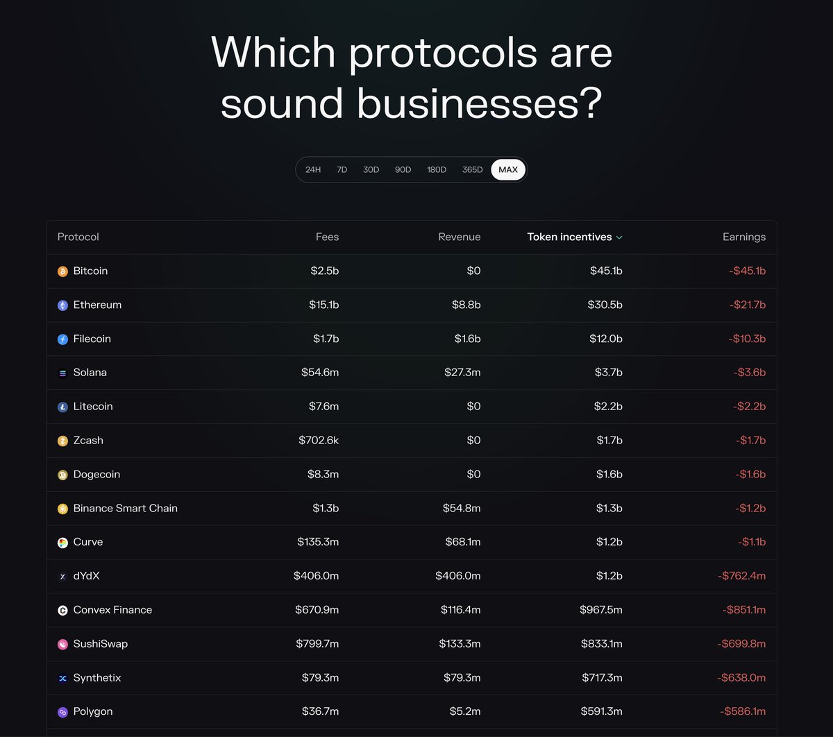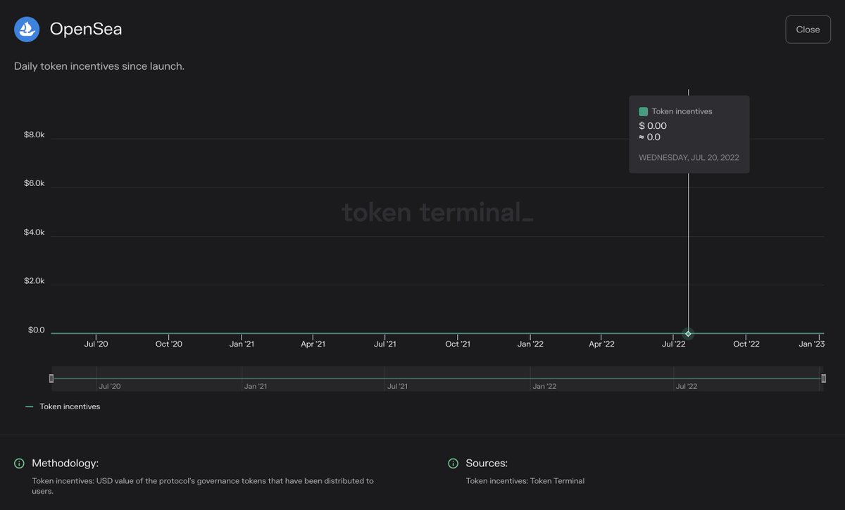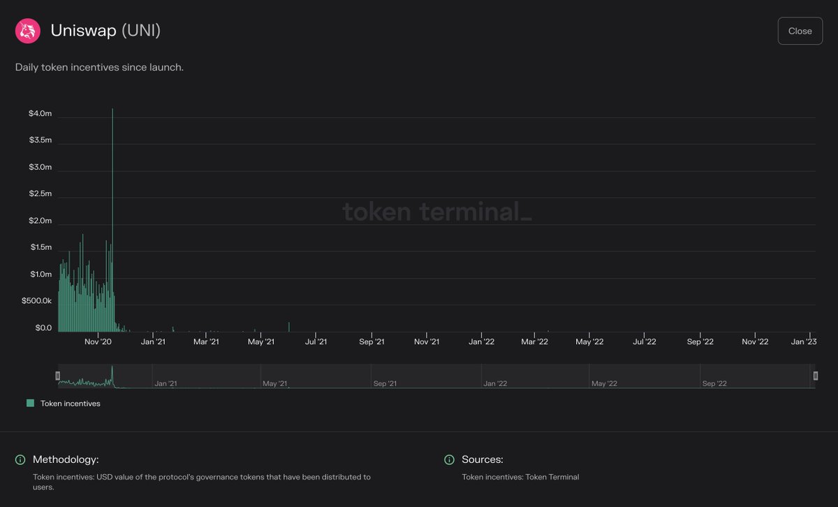 Token incentives; This metric tells how much the protocol spends on user acquisition by issuing & distributing its governance tokens to users. It’s worthwhile to analyse this metric as a % of revenue, to get a sense of the economic sustainability of a protocol.