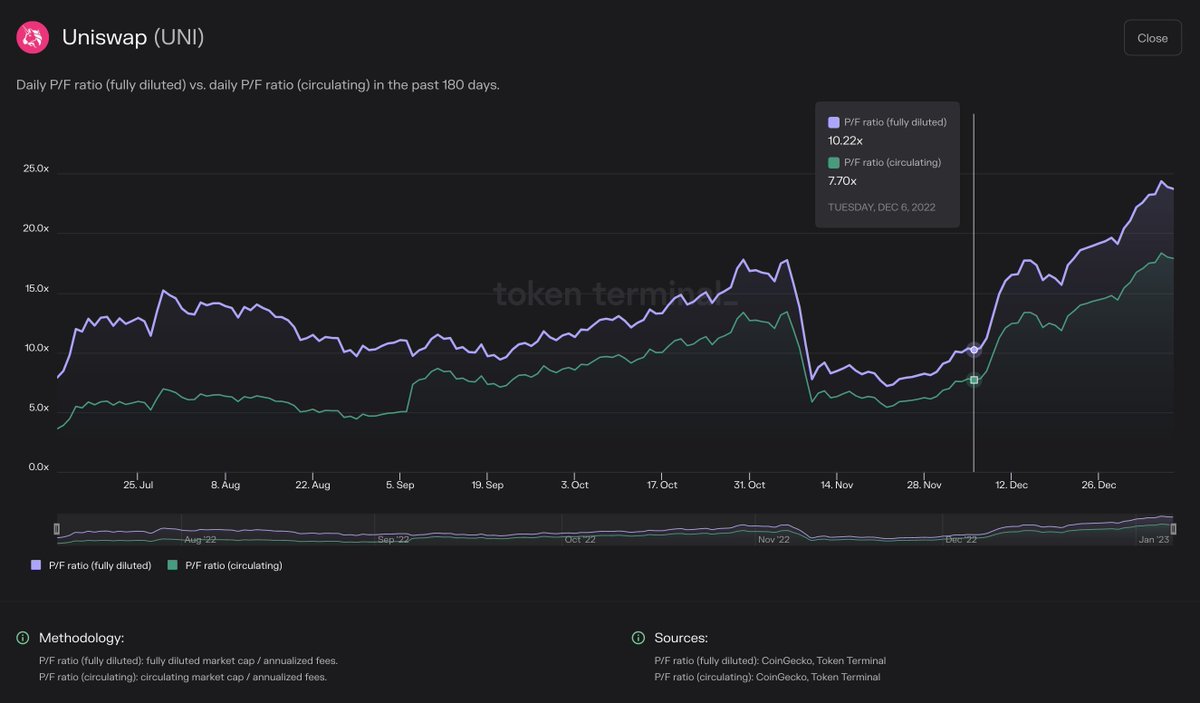 Price to fees (P/F) ratio: This metric tells us the relationship between a protocol’s market capitalisation and the fees it generates per year. All things equal, a lower ratio is usually better from an investor’s point of view.