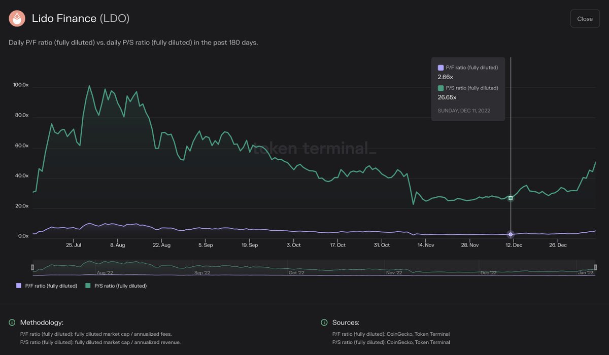 Price to sales (P/S) ratio: This metric tells us the relationship between a protocol’s market capitalisation and the revenue it generates per year. All things equal, a lower ratio is usually better from an investor’s point of view.