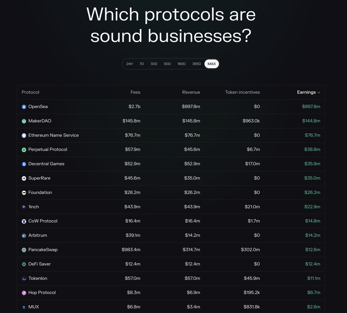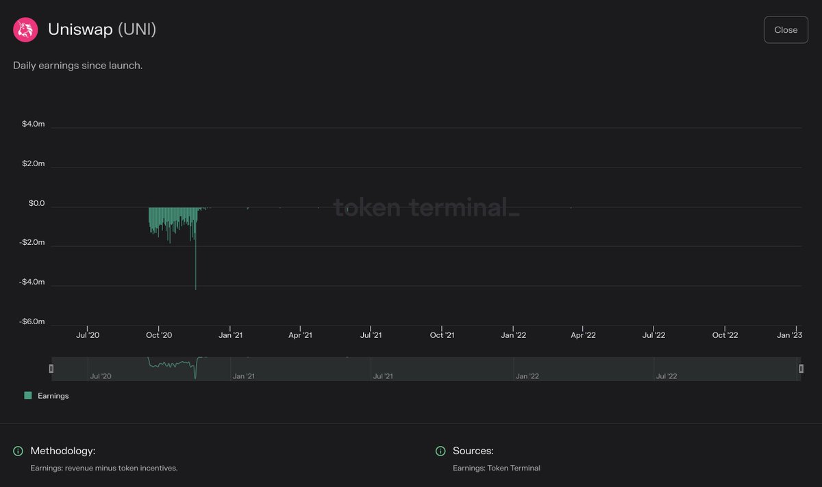 Earnings: This metric tells us how much the protocol has left of the revenue after subtracting the token incentives. This metric should still be subtracted by the operational expenses of the DAO to arrive at a true net income figure.